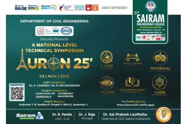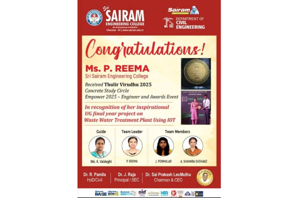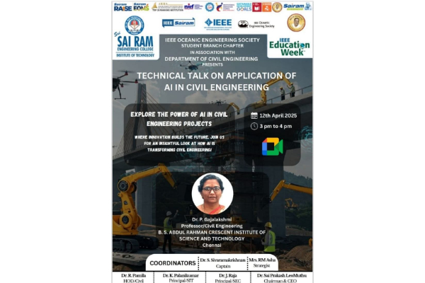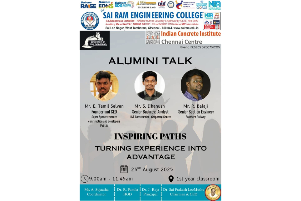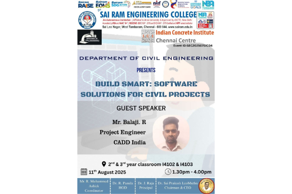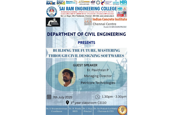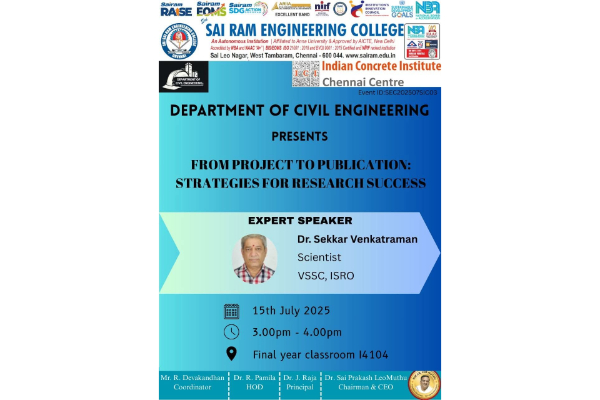 The principal educational objective of our department is to Excel in the fundamentals of mathematics, basic sciences, communication and Civil Engineering concepts to solve the real world Civil Engineering problems by imparting sound technical knowledge. The Association of Civil Engineers is regularly organizing seminars, guest lectures and industrial visits for the benefit of student community. Our Department has been a member of Indian Concrete Institute (ICI) with effect from October 2016.
