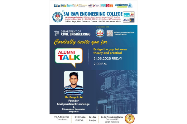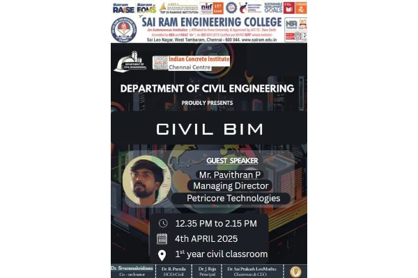 Join us for an insightful session on CIVIL BIM by Mr. Pavithran P, Managing Director of Petricore Technologies. Date: 4th April 2025 Time: 12:35 PM to 2:15 PM Venue: 1st Year Civil Classroom Organized by the Department of Civil Engineering, Sai Ram Engineering College in association with Indian Concrete Institute – Chennai Centre. Let’s explore… Continue reading Embrace the Future of Civil Engineering with BIM